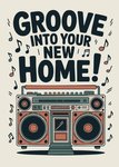 Front of card: Featuring a retro-style boombox illustration with musical notes surrounding it & large bold black lettering above, all on a light grey background.
