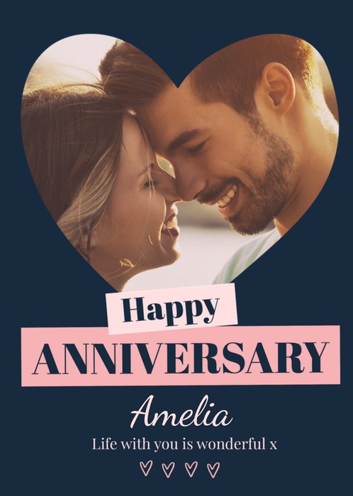 A loving and affectionate Anniversary card featuring one large photo upload area in the centre inside of a love heart frame.