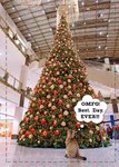Featuring a photograph of a cat looking mischievously at a giant Christmas tree. There is a speech bubble coming from the cat.