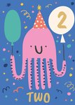 Front of card: Featuring an illustration of a cute octopus holding balloons in two of its tentacles while wearing a party hat with colourful dots and party streamers in the background.