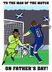Front of card: Scotland Footballer Man Of The Match Father's Day Card Ilustration of Scottish footballer wearing Dad football shirt. Text reads:"To The Man Of The Match On Father's Day"