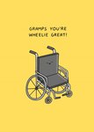 Featuring a bright yellow background with a playful, pun-filled message. The text at the top is a black handwritten-style font. The central illustration is a simple and charming drawing of a grey wheelchair, which has a smiling face on the backrest, giving it a friendly and whimsical character. The design uses light humour and a pun on the word "wheelie" to celebrate and show appreciation for a grandparent, with a cheerful and positive tone.