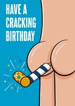 Featuring an illustration of a person's bare buttocks, humorously depicted with a brightly coloured party blower inserted between the cheeks. The party blower is exploding with confetti-like decorations. To the left of the image, bold white text on a blue background, playing on the word "cracking" as a pun related to both the explosion of the party blower and the person's behind. The style is cartoonish and lighthearted.
