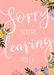 Front of card: Sorry You're Leaving Card Scriptive typography surrounded by flowers on a pink background. Text reads: "Sorry you're leaving Polly". 'You're' and 'Polly' can be personalised!