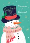 Front of card: Featuring a festive illustration of a snowman. Text reads: