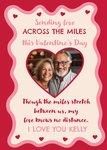 Front of card: Featuring a sentimental message with a heart shaped photo frame. Text reads: "Sending love across the miles this Valentine's Day though the miles stretch between us, my love knows no distance. I love you Kelly". 'Across the miles' and 'I love you Kelly' can be personalised!