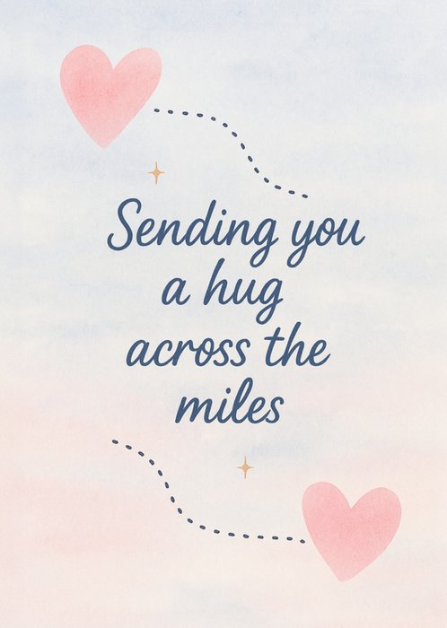Featuring a hand-lettered script message surrounded by dotted trails connecting two pink hearts, with small sparkles on a pale blue gradient background.