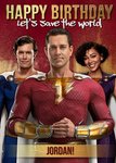Front of card: Shazam! Birthday Card Featuring Shazam, Super Hero Freddy and Super Hero Darla. Text reads: "Happy birthday let's save the world Jordan!". 'Jordan' can be personalised!