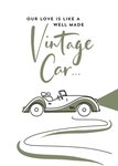 Simple Life simple illustration of an old vintage car. The non editable, typographic caption reads Our Love Is Like A Well Made Vintage Car. The card background colour is white.