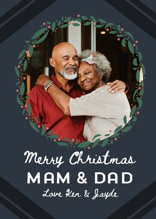 Front of card: Christmas Wreath photo frame in center of card on navy background with white text below Text reads: Merry Christmas Mam & Dad. Love Ken & Jayde. With customisable text.