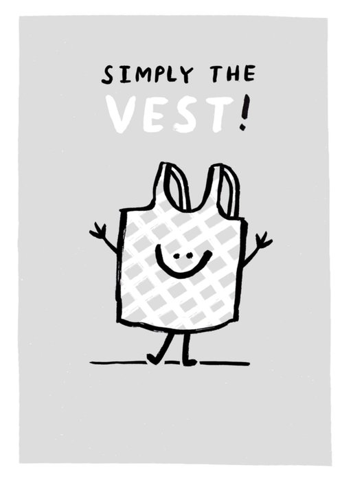 Front of card: Featuring a funny illustration of a string vest with a brush-style pun message above. The design sits on a speckled grey background with a white edge.