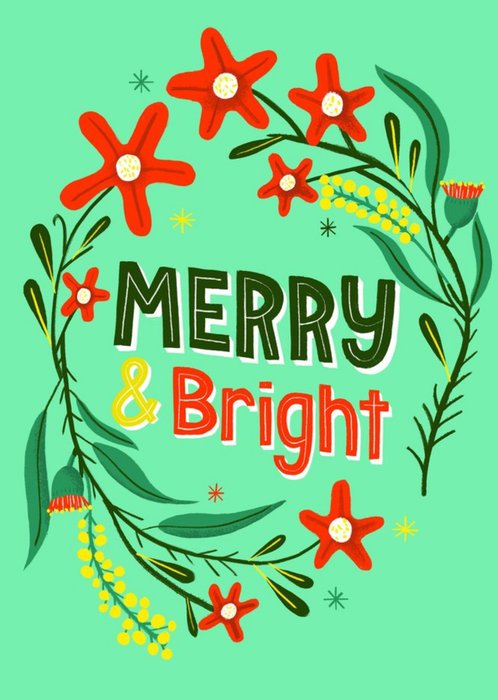 Illustrated bright floral wreath with typography in centre on a green background.