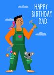 Front of card: Illustrated man with hammer and whisk in hands and flowers and koala in dungarees pocket with bird on shoulder on a blue background with clouds. Text reads: "Happy Birthday Dad"