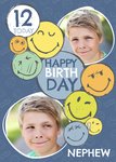 Front of card: Featuring two circular photo frames with smiley face illustrations. Text reads: "12 today happy birthday nephew". '12' and 'nephew' can be personalised!