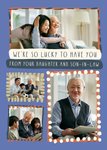 A warm and colourful Father's Day card featuring four photo frames arranged against a textured, artistic background. This cheerful design shares a loving message of gratitude from a daughter and son-in-law to a special father figure.
