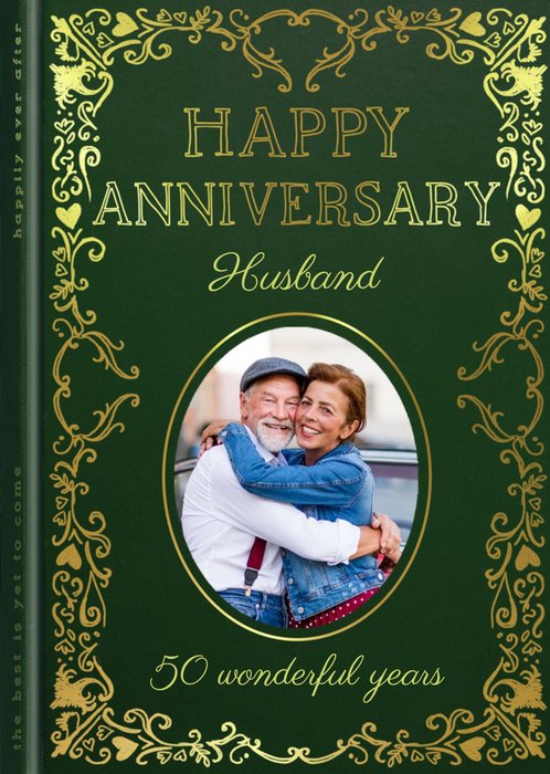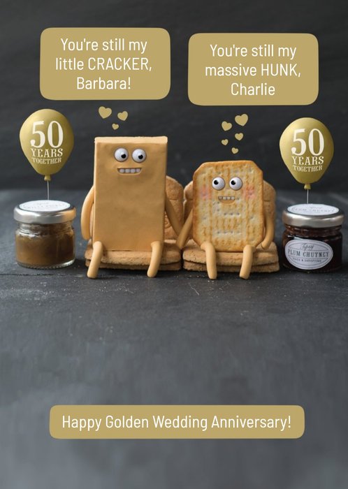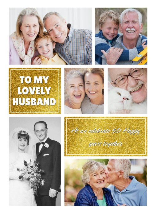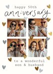 A modern greeting card featuring four square photo frames arranged in a neat grid, playful gold and grey hearts, and flowing anniversary lettering, set against a crisp white background.