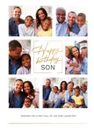 The greeting card features a collage-style design with multiple photo frames arranged around a central message that reads “Happy Birthday Son” in elegant gold and black fonts. Below the collage, there is an additional message that says, “Wishing you a day full of joy and laughter,” creating a warm and celebratory tone on a clean white background. There are six photo upload areas in different sized rectangular frames.