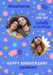 Front of card: Photo Upload Anniversary Card Space themed Illustration with flash shaped photo frames. Text reads: "Stephanie you are my whole universe happy anniversary Jackson". 'Stephanie' and 'Jackson' can be personalised!