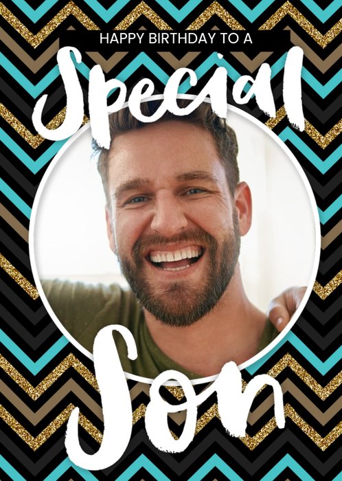 A modern birthday card design with two photo upload frames. The text is styled in serif and cursive fonts, and a large editable number is positioned between the two photos in a rust-orange circle.