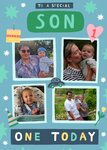 Featuring a banner above & below containing text, with 4 central photo upload frames surrounded by illustrations of a toy car, party hat, a tulip, a heart containing the number 1, & a slice of birthday cake, all on a blue background of star patterns.