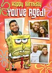Front of card: Featuring an illustration of SpongeBob SquarePants looking worse for wear with three photo frames. Text reads: "Happy birthday you've aged".