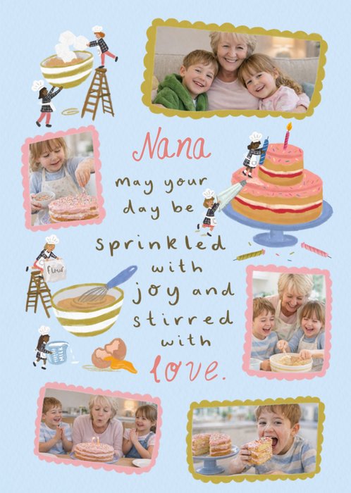 Featuring five photo areas with scalloped frames alongside cute illustrations of bakers making cakes, mixing bowls, sprinkles, and a tiered cake with a candle on a light blue background.