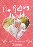 Front of card: Featuring a heart shaped photo frame on a pink background. Text reads: "I'm Gwraig Hardd, Dydd Santes Dwynwen Hapus Charlotte". 'Charlotte' can be personalised!