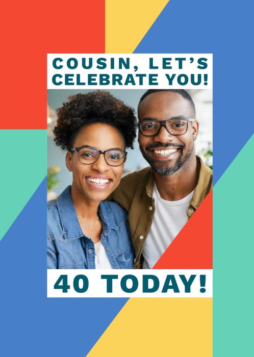 Featuring a photo upload area in the centre with a vibrant pattern composed of colourful shapes in shades of green, blue, red, and yellow, with bold text above and before the photo frame, creating a festive and eye-catching design perfect for celebrating a cousin’s Birthday.