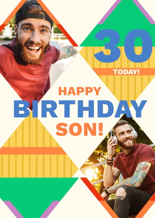 Featuring cheerful text written in bold, capitalised letters. There are four diamond shapes with different coloured patterns inside two of them, and the other two include photo upload areas, creating a festive and eye-catching design perfect for celebrating a son's 30th Birthday.