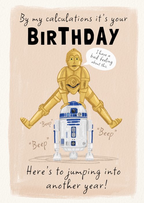 The greeting card features a playful illustration of two iconic sci-fi droids, C-3PO and R2-D2. C-3PO is seen awkwardly leaping over R2-D2 with a speech bubble saying, “I have a bad feeling about this.” The text reads, “By my calculations it’s your Birthday” at the top and “Here’s to jumping into another year!” at the bottom. R2-D2 is depicted making his signature “beep” sounds, and the background has a light, soft beige tone.