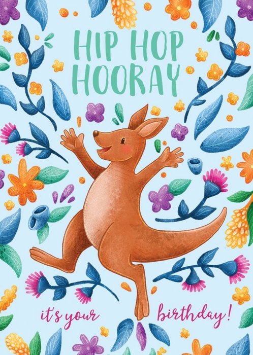 Front of card: Illustration of colourful flowers and leaves around the border of card, with kangaroo in centre and hand lettering on blue background Card reads: "Hip Hop Hooray it's your birthday!"