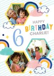 Front of Card: Colourful hexagon photo frames with rainbows, clouds and stars on a white and grey striped background with photo uploads around the text in center.