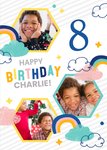Front of Card: Colourful hexagon photo frames with rainbows, clouds and stars on a white and grey striped background with photo uploads around the text in center.