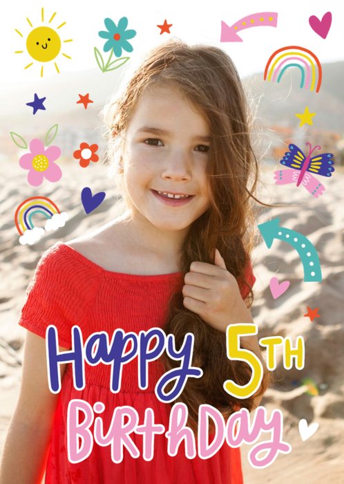 A sweet and bold Birthday card featuring hand-drawn hearts and stars. There is one photo upload area inside the number '5'.