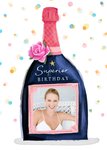 Front of card: Featuring an illustration of a bottle of wine with a photo frame label surrounded by colourful confetti. Text reads: "Superior birthday".