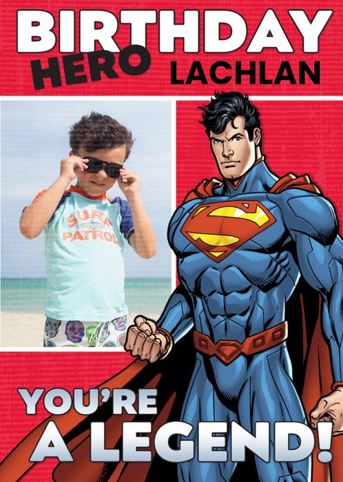 A comic-inspired Superman birthday card with a dramatic cityscape background and bold red and blue lettering. Featuring one circular photo upload frame beside the iconic hero, it’s ideal for celebrating someone’s big day in legendary superhero style.