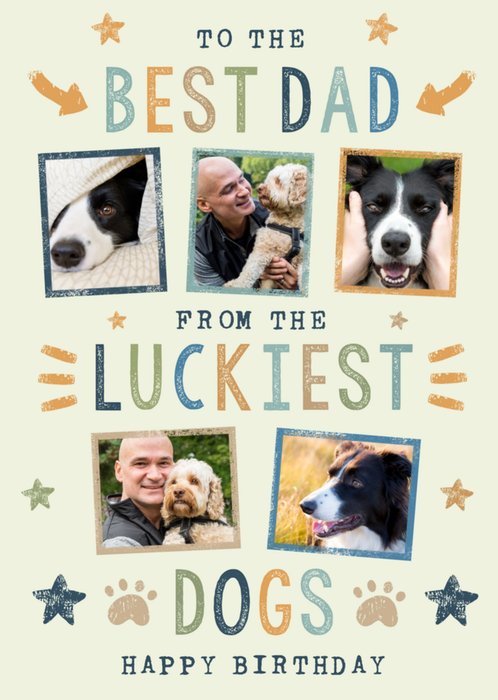 A sentimental and loving Birthday card for a dog dad featuring multi-coloured print textured text with five photo upload areas, there are also stars and arrows in the background.