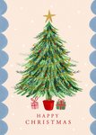 Front of card: A warm and sweet Christmas card featuring a hand-painted Christmas tree with wrapped present underneath it, the tree is covered in baubles and string lights with a star on top. The sides of card is framed by a scalloped edge border.