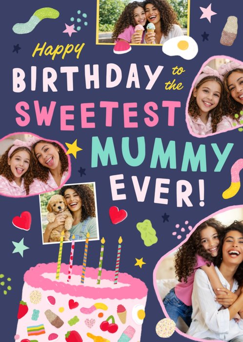 Featuring 5 photo upload areas & bold typography with colourful sweet shapes, plus an iced birthday cake with candles on a dark blue coloured background.