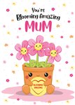 A cute and loving Mother's Day card featuring a cute and colourful design with an illustrated smiling plant pot character holding three pink flowers with happy faces. The main text on this card is in a playful font with a yellow love heart sweet that the plant pot is holding, with the words "blooming amazing" written on it. The background is white with small flowers scattered around, creating a cheerful and festive atmosphere. This card is a lovely way to celebrate and appreciate one's mum on this special occasion.