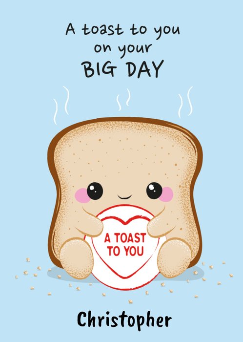 Features a central plush toy of a kawaii style slice of toast with a face, it's holding a love heart that reads 'a toast to you.'