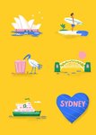 Front of card: Sydney Card Sydney themed spot art illustrations including the Sydney Opera House, bondi surfer, bin chicken, Sydney Harbour Bridge, Manly Ferry and a heart. Text reads: "Sydney".