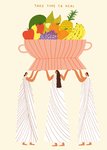 An artistic greeting card featuring three women in flowing gowns lifting a large bowl filled with vibrant fruit, symbolising nourishment, healing, and care.