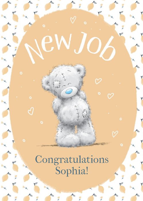Me To You Tatty Teddy design featuring an orange oval panel that sits in the middle of the card, with Tatty Teddy standing in it, surrounded by white outlined lovehearts. The card backgound is white with a pattern of lemons and flowers. The non editable caption reads New Job, followed by the editable Congratulations Recipient's Name.