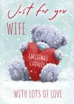 Front of card: Featuring a festive illustration of Tatty Teddy with a large heart. Text reads: "Just for you wife with lots of love". 'Wife' and 'with lots of love' can be personalised!