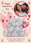 Front of card: Featuring a cute illustration of two Tatty Teddies surrounded by love hearts with a circular photo frame. Text reads: "Happy Valentine's Day to many more moments of sweetness between us.". 'To many more moments of sweetness between us.' can be personalised!