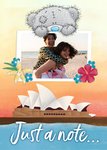 Front of card: Card Features an Illustration of Tatty Teddy holding a Photo Upload Frame with Flower around this with an illustration of the Sydney opera house under this.