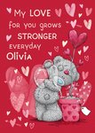 Front of card: Featuring a cute illustration of Tatty Teddy watering a plant with flowery hearts. Text reads: "My love for you grows stronger everyday Olivia". 'Olivia' can be personalised!
