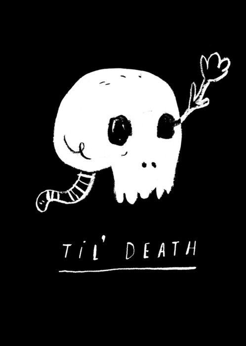A playful monochrome card featuring a smiling skull with a worm and heart-shaped flower, drawn in a sketchy hand-drawn style, paired with the phrase “Til’ death”.
