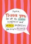 Featuring a thank you message written in a speech bubble against a background of vertical red and pink stripes. The words "THANK YOU," "LAUGHS," "MAGIC," and "my world" are highlighted in different colours, adding emphasis and visual interest to the text. The overall design is playful and vibrant, conveying a heartfelt appreciation.